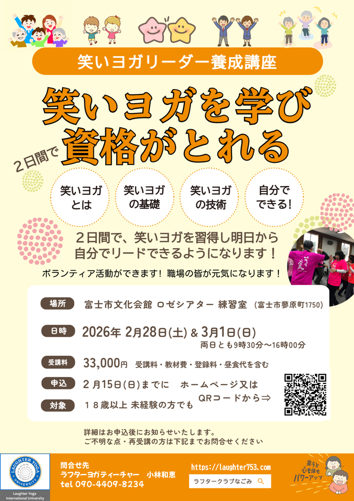 2月28日(土)・3月1日(日)の2日間で笑いヨガの資格がとれる笑いヨガリーダー養成講座